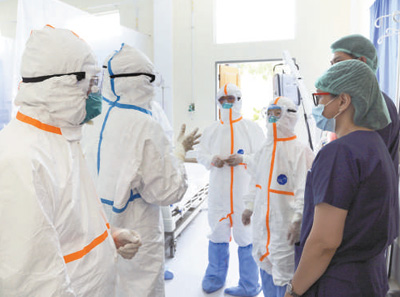 4月10日,在緬甸仰光北奧卡拉帕醫院,中國援緬抗疫醫療專家組調研該院發熱診區,與緬方分享防疫抗疫經驗。