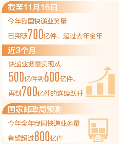 700億件!國家郵政局監測數據顯示:截至11月16日,今年我國快遞業務量已超700億件,超過去年全年。近3個月,快遞業務量實現從500億件到600億件、再到700億件的連續躍升。