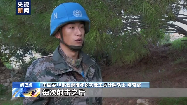 中國第19批赴黎維和多功能工兵分隊戰士 陳有富: 這次的射擊在雨中進行,能見度比較低,每次射擊之後,瞄準的覘孔都會被水霧矇住,使目標更加得模糊。其次,這邊的下雨天天氣比較冷,風比較大,在每次射擊過程中扣動扳機的手指都不太靈活。