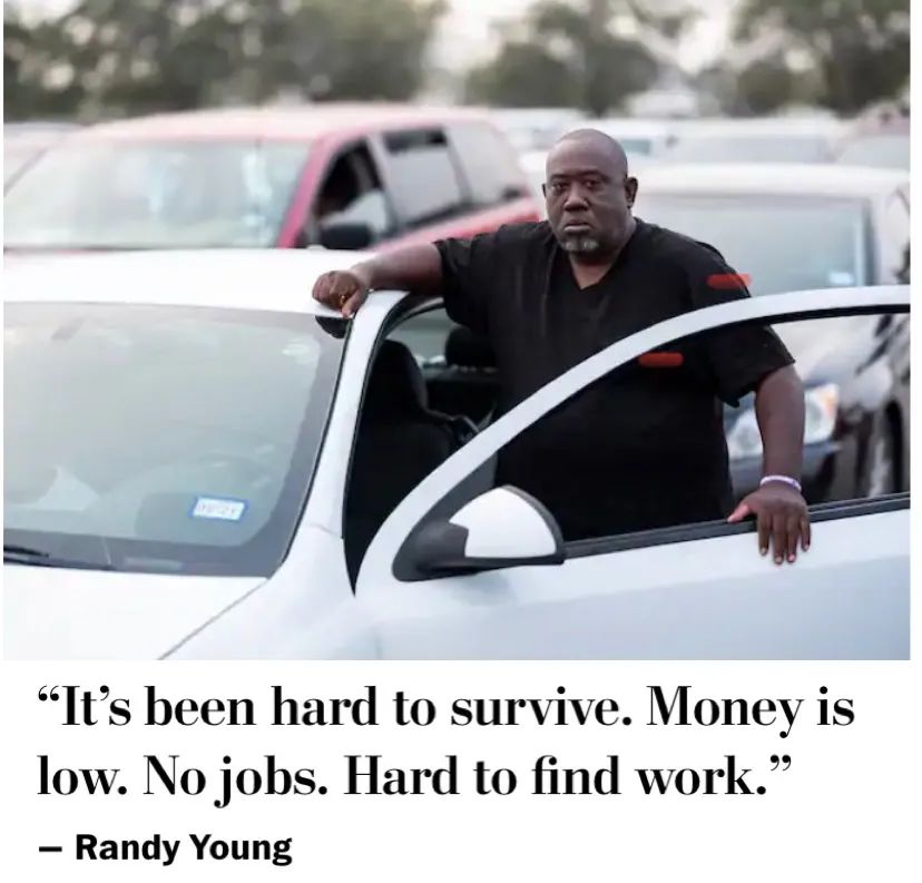 在剛剛過去的週末,美國休斯敦市NRG體育場外像往常一樣排滿了領取免費食品的人們。蘭迪·揚也在排隊。他無奈地告訴記者:“活着太難了。錢太少,沒有工作。很難找到工作。 ”