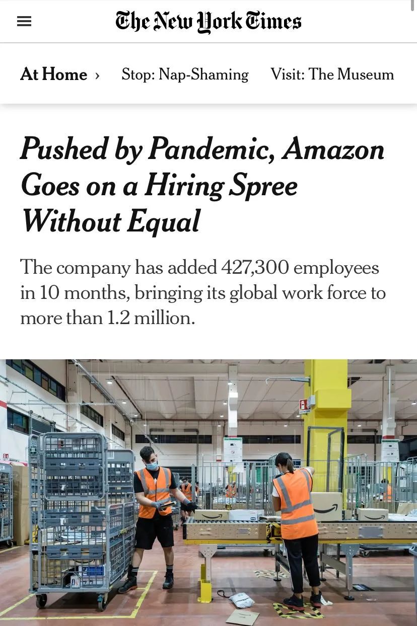 △《紐約時報》:過去10個月,亞馬遜新增超過42萬名僱員,使其全球僱員總數超過120萬人。