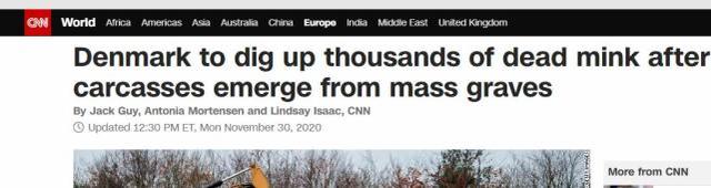 11月早些時候,丹麥發現有12人感染了一種新冠病毒變異株,該病毒從人傳給水貂再傳回給人,於是丹麥下令撲殺全國所有的養殖水貂。在丹麥西部的一個軍事區,大約1700萬隻水貂被毒氣毒死,並埋在戰壕裏。這些屍體被埋在兩米深的泥土下,但數百具屍體隨後又衝出泥土回到地面上。