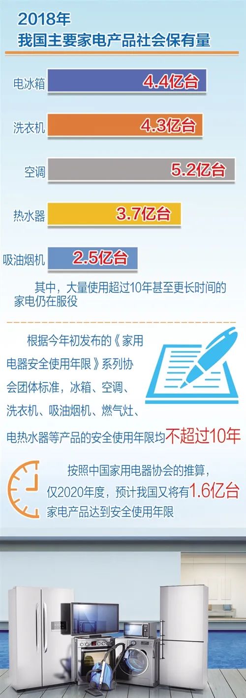 數據顯示,2018年,我國主要家電產品社會保有量分別是:電冰箱4.4億台、洗衣機4.3億台、空調5.2億台、熱水器3.7億台、吸油煙機2.5億台。其中,大量使用超過10年甚至更長時間的家電仍在服役。