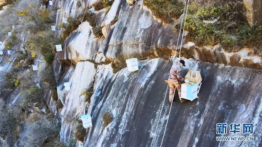 在馮家峪鎮懸崖上,錯落有致地懸掛着約600個蜂箱,成千上萬的小蜜蜂飛來飛去辛勤勞作。“這是全國最大的崖壁蜂場,為的是保護瀕危中華蜂。它專採零星蜜源,蜂蜜很好吃,當年乾隆曾御封這種原生態蜂蜜為‘琥珀蜜’。而其對零星花卉植物授粉,對我國森林物種延續起着相當大的作用。飼養這種蜜蜂需要傳承,要是我幹不動了,就讓兒子也來養蜂!”年逾80歲、有着豐厚養蜂經驗的南台子村吳大爺笑言。