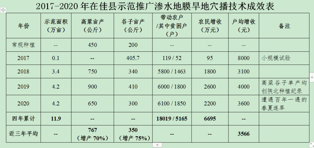 *2017年以來,科技部已將滲水地膜旱地穴播技術推廣到陝北、晉中北、寧南等更多幹旱半乾旱地區,累計示範500餘萬畝,增產糧食5億公斤。*示範推廣滲水地膜旱地穴播技術取得顯著成效,開闢了一條科技創新驅動糧食增產、農民增收的新途徑,樹立了一個“藏糧於技”的科技扶貧典型。該項技術創新團隊負責人姚建民研究員因此榮獲2019年度“全國脱貧攻堅創新獎”、2020年度“第二屆全國創新爭先獎”。
