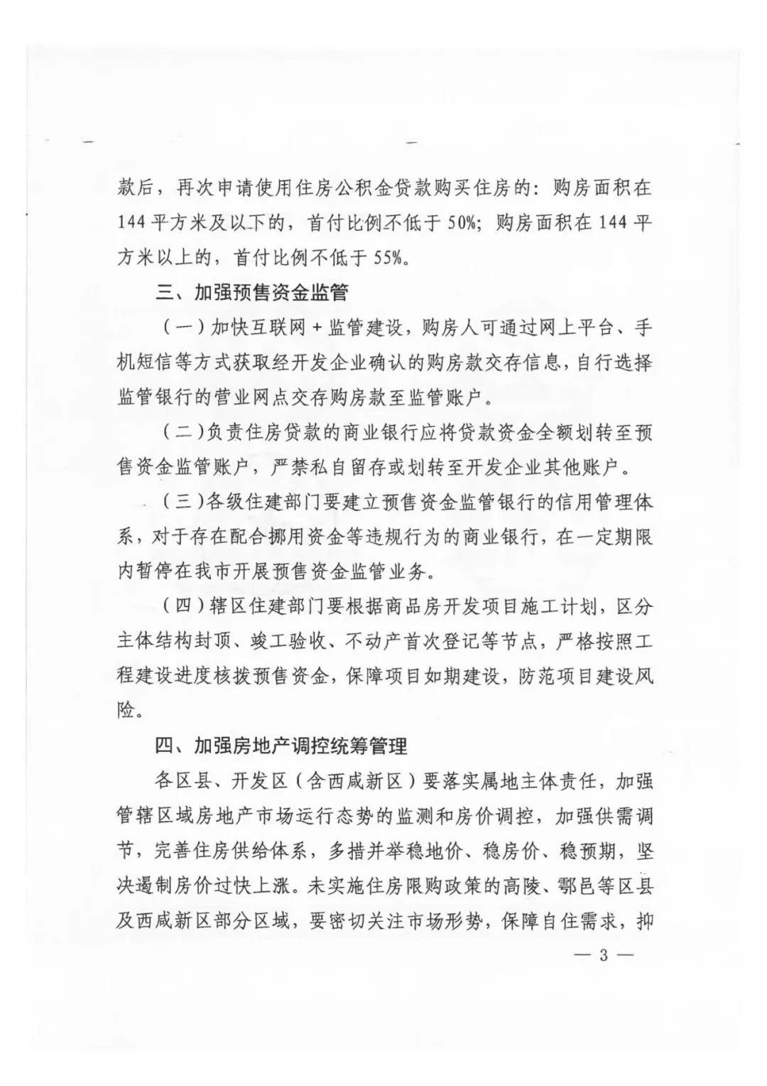 3. 在我市已擁有住房面積在144平方米以上的居民家庭:購買第二套住房面積在144平方米及以下的,商業貸款首付比例不低於60%;購買第二套住房面積在144平方米以上的,商業貸款首付比例不低於70% 。