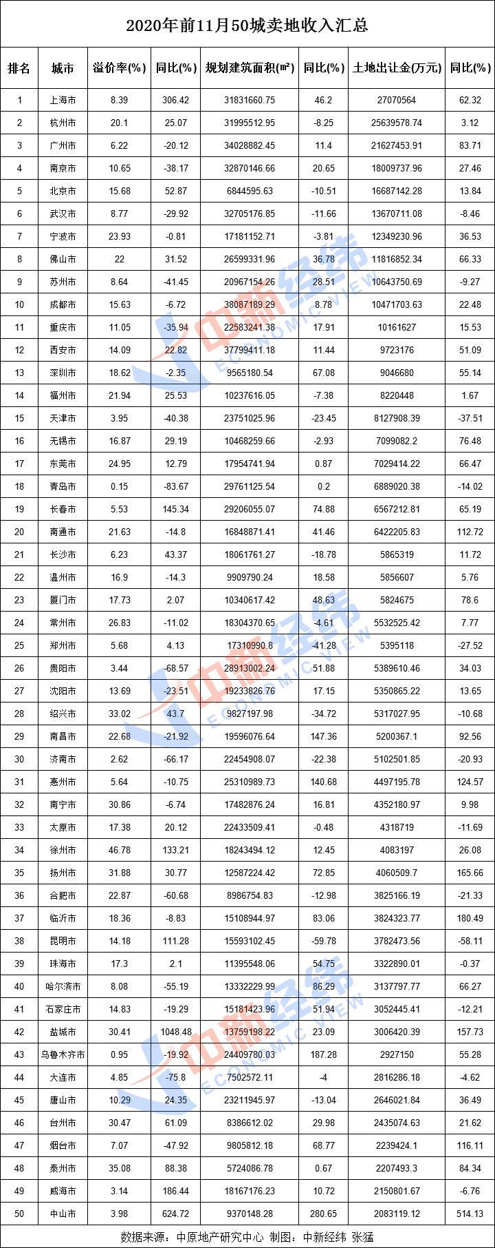 中原地產研究中心統計數據顯示,2020年前11月50城賣地收入3.67萬億,同比增20.8%,均刷新歷史紀錄。