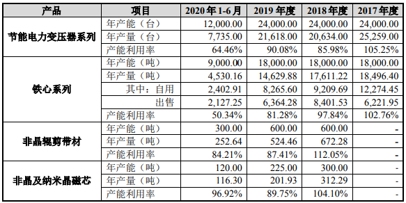 也即,公司在報給姜堰區生態環境局的資料中顯示,“原有非晶鐵芯25000噸/年產能、原有25000台/年的非晶變壓器產能”,這與招股書披露的數據存在重大差異。