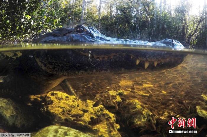 資料圖:2019年10月30日,在佛羅里達州的國家保護區,一隻短吻鱷在水中覓食。