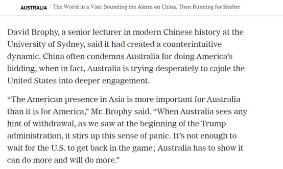 如下圖所示,在這篇分析中澳關係的報道中,《紐約時報》採訪的一位來自澳大利亞悉尼大學的專家就表示,雖然中國常常指控澳大利亞聽命於美國,“但實際上,是澳大利亞在拼命地攛掇美國來進一步加深與澳大利亞的關係”。