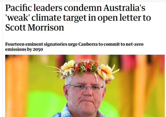 (截圖來自英國《衞報》的報道,內容是南太平洋各島國最近聯名寫信譴責澳大利亞莫里森政府在氣候變化上不作為,導致這些島國不得不面對着氣候危機所帶來的滅國風險)