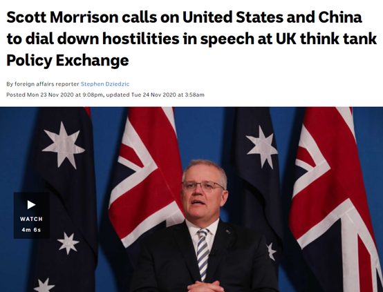 對此,澳大利亞廣播公司這家澳大利亞的半官辦媒體就認為,莫里森的意思是希望中美不要加劇對立,從而讓澳大利亞在中間難做。儼然一副澳大利亞只是中美爭鬥的“受害者”的姿態。