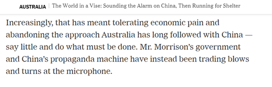 另外,《紐約時報》還在最新的這篇報道中分析説,恰恰是因為澳大利亞如此迫切地希望取悦美國,所以該國在近些年才會不顧中澳的經貿關係,處處挑釁中國,並頻繁地與中國“打嘴仗”。