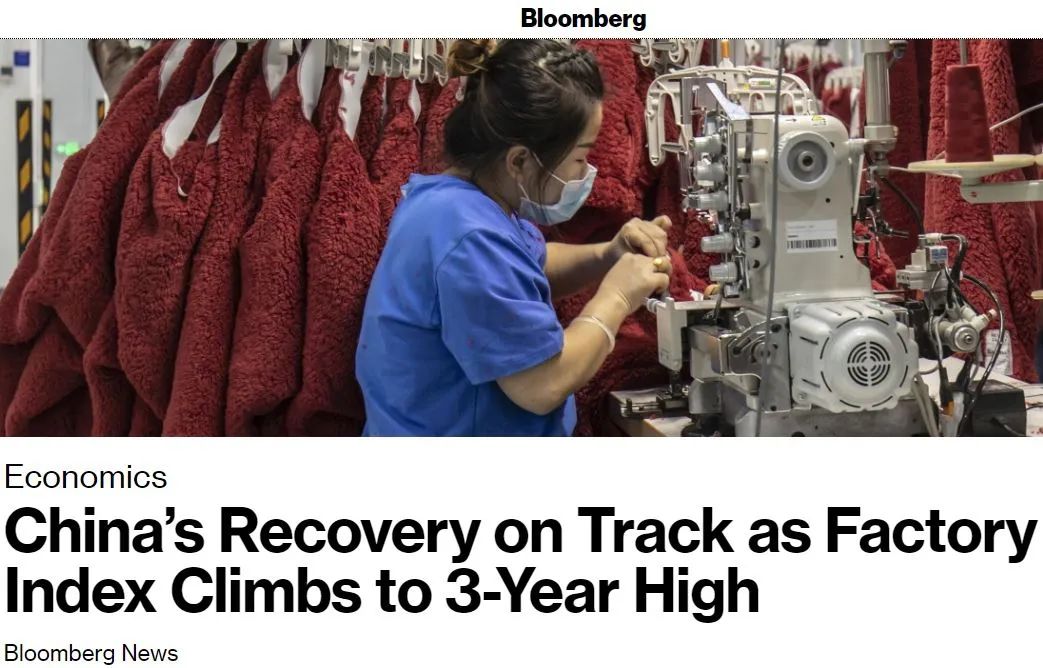 彭博社 發表題為《隨着製造業指數攀升至三年來高位,中國經濟復甦步入正軌》的文章説,中國是唯一一個在新冠肺炎疫情引發的經濟衰退中持續強勁反彈的主要經濟體,最新數據凸顯了中國的全球經濟地位。