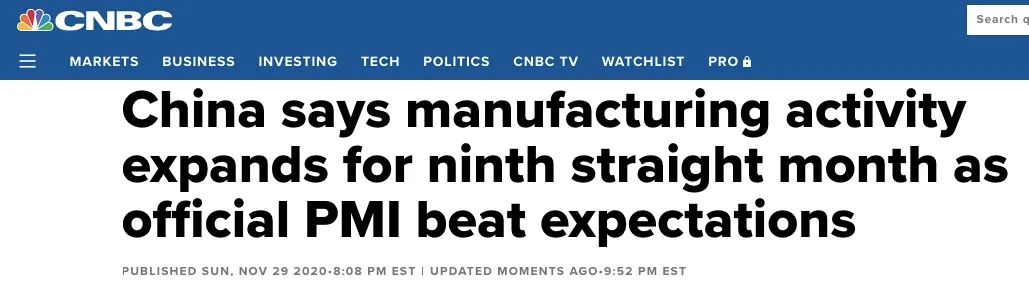 美國消費者新聞與商業頻道(CNBC)網站 在題為《PMI指數超過預期,中國製造業連續第九個月擴張》的報道中,援引中國國家統計局專家的話分析了推動11月中國製造業活力增強的四個因素:產需兩端協同發力、進出口景氣度穩步回升、價格指數升幅較大、大中小型企業景氣度均有所回升。