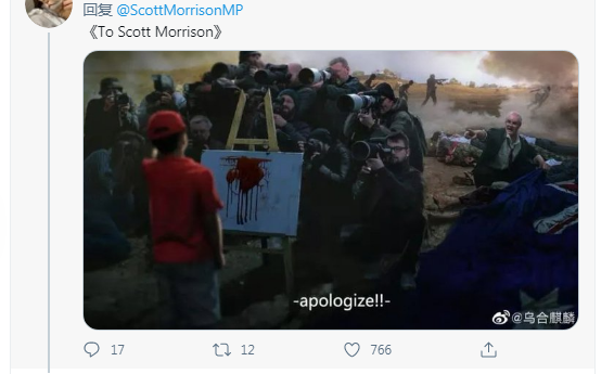 12月1日晚間,中國青年漫畫家“烏合麒麟”發佈新作《致莫里森》。很快,這張圖多次出現在了澳大利亞總理莫里森最新的推特評論下,有網友留言説,“你要的道歉”。 此前,莫里森因中國外交部發言人趙立堅在推特發佈“烏合麒麟”另一張描述“澳士兵殘殺少年”的漫畫,而要求中國政府道歉。