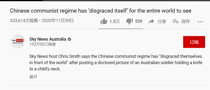 這段在標題宣稱要聲討“中國共產黨政權”的新聞視頻,在開頭引用澳方關於本次爭議的解讀,按着部分反華政客的口徑,單方面地曲解我外交部發言人的原意和轉發漫畫的內容,對中方進行抹黑和歪曲。
