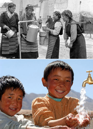 這張拼版照片的上圖:西藏江孜古鎮居民在取水。西藏江孜古鎮千百年來靠人背畜馱飲水,上個世紀80年代,江孜古鎮建起一座小型自來水廠,解決了人畜飲水問題;下圖:西藏拉薩達孜縣(現達孜區)朗熱村的兒童在用自來水洗臉(資料照片)。新華社發