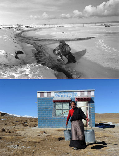 這張拼版照片的上圖:西藏納木湖鄉一名牧民在河邊取水(資料照片);下圖:那曲市聶榮縣白雄鄉的央金卓瑪從村口的飲水安全工程井裏取水回家(2011年11月9日攝)。新華社發