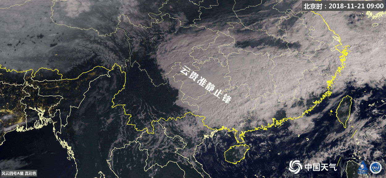 2018年11月21日9時-15時的衞星雲圖上,可以看到明顯的雲貴準靜止鋒。雲系的前沿在雲南東部,晴天和陰天,涇渭分明。(來源:國家衞星氣象中心)