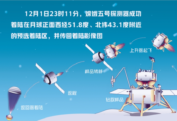 成功着陸後,着陸器在地面控制下,進行了太陽翼和定向天線展開等狀態檢查與設置工作,將正式開始持續約2天的月面工作,預計將採集2千克左右的月球樣品。