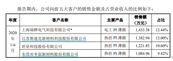 首先值得關注的就是瑞華泰披露的銷售信息,根據招股書披露的數據,瑞華泰的熱控PI薄膜在2018年的銷售單價為397.82元/千克,相比2017年增長了13.75%。招股書也披露,“江蘇斯迪克新材料科技股份有限公司”是公司熱控PI薄膜客户,今年上半年更是以1382.94萬元的採購額,成為瑞華泰熱控PI薄膜的第一大客户。