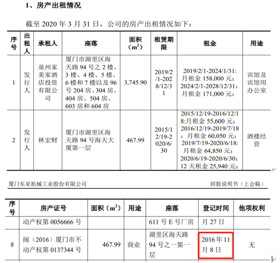 此外,根據招股書第185頁披露的信息,東亞機械將所擁有的“廈門市湖裏區海天路94號海天大廈第一層”對外出租用於酒樓經營,雙方簽訂租賃協議最早可以追溯到2015年12月。但是根據招股書第173頁披露的固定資產相關信息,東亞機械獲得“廈門市湖裏區海天路94號海天大廈第一層”的產權登記,卻是在2016年11月8日,相比將此處房屋出租用於酒樓經營晚了近一年時間。換言之,東亞機械再將上述房屋出租用於獲得租金時候,上不擁有對應房屋的所有權。
