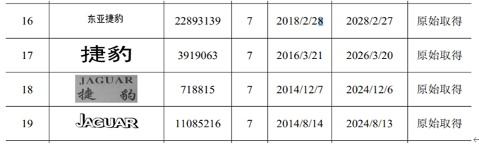 值得關注的是,根據招股書披露,東亞機械主營產品包括“捷豹JAGUAR”系列壓縮機,品牌名稱與捷豹路虎使用相似名稱的知識產權,對此招股書也披露“可能存在相關第三方認為公司侵犯其知識產權的風險,並引致爭議或者糾紛”。從招股書披露的商標註冊信息來看,東亞機械註冊“捷豹”、“JAGUAR”商標的時間在2014年到2016年之間。