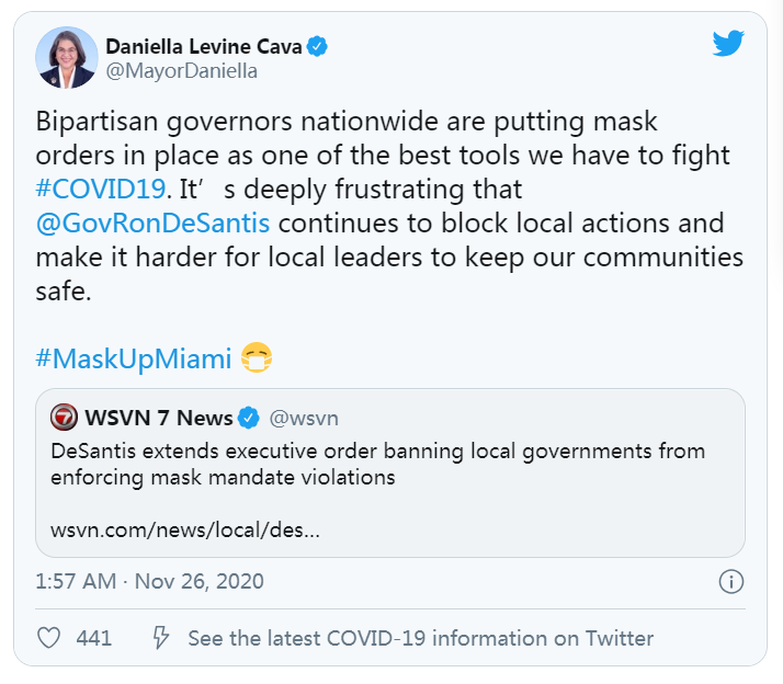 德桑蒂斯延長禁令後,邁阿密戴德市市長達尼拉·萊文·卡瓦在推特上發文表示:“全國的兩黨州長都在訂購口罩,這是我們對抗新冠病毒的最佳工具之一。而德桑蒂斯州長繼續阻止地方政府的防疫行動,這讓我們非常沮喪,也讓地方領導人更難保護我們社區的安全 。”