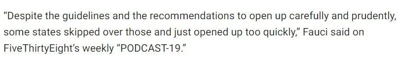 美國國家過敏症與傳染病研究所所長、白宮新冠病毒應對工作組關鍵成員福奇指出,佛羅里達州越過了所有防疫指導方針,並且過快地重新開放,這直接導致了當地疫情的迅速惡化 。