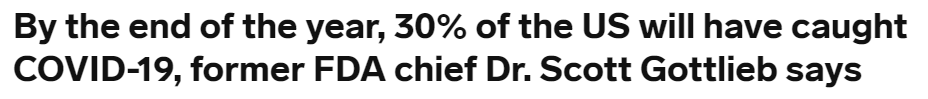 美國食品和藥物管理局(FDA)前局長戈特利布在接受採訪時悲觀地預計,到今年年底將有30%也就是約1億美國人感染新冠病毒。而由於很多感染者並未接受過病毒檢測和最終診斷,實際感染人數可能比官方統計數字高得多 。