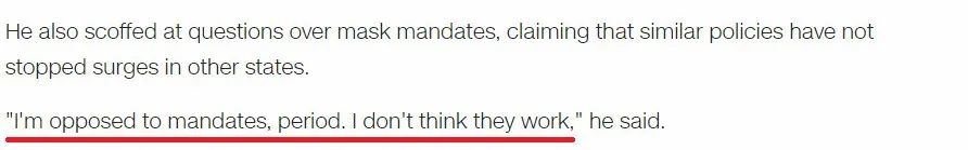 德桑蒂斯還在發佈會上重申,反對強制關閉企業和佩戴口罩等與疫情相關的限制措施——“我反對口罩強制令,就是這樣。我認為口罩根本沒用” 。