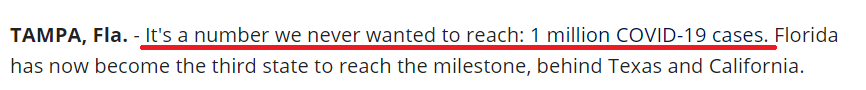 繼得克薩斯州和加利福尼亞州之後,佛羅里達州當地時間2日成為美國第三個新冠肺炎累計確診病例超過100萬的州 。而此時,全世界累計病例超過百萬的國家也不過12個。
