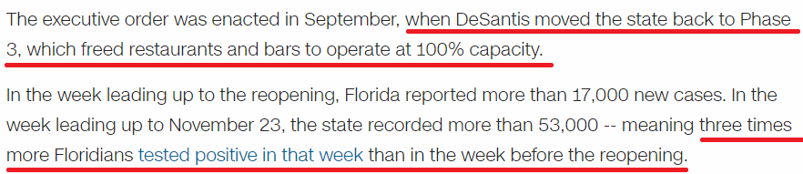 此舉的後果不久後便顯現出來:在解封前的一週,佛州報告了1.7萬多個新增病例;而在11月的第三週,這個數字超過了5.3萬,是解封前一週的三倍還多。