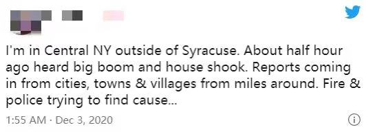 一位推特網友寫道:“我在紐約市中心,雪城大學外面。半小時前我聽到巨大聲響,房子在震。警察正在調查原因。”另一位推特網友稱:“我在雪城聽到了爆炸聲,希望每個人都安全。”不少人留言附和,表示自家房子都在搖晃。還有網友説:“我的第一個反應是去查看房頂上有沒有倒下的樹,我的下一個想法是隕石砸下來了!”另一名網友則開玩笑稱:“嗚哇,是誰讓外星人在12月接管了地球?”