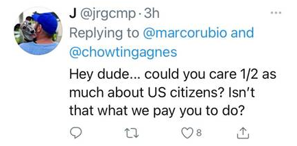 “唐納德·特朗普正在破壞美國民主,他的失敗抗疫政策正導致每天數千人死亡,然而馬爾科(盧比奧)卻在關注香港。”
