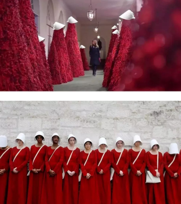 網友説這場面像極了恐怖片,聖誕樹還被網友P成電影《使女的故事》: