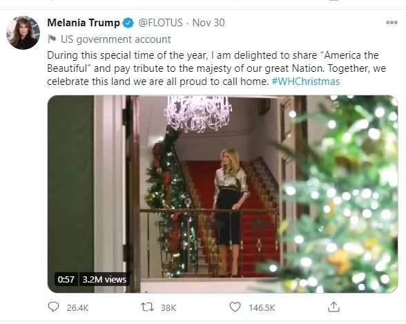梅拉尼婭發推説:“在一年中的特殊時刻,我很高興與大家分享‘美麗的美國’,並致敬我們的國家。”