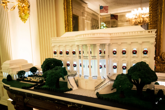 走進餐廳,這個精緻的白宮西樓模型,實際上是個 “薑餅屋”,據報道,為了做成它,糕點團隊使用了275磅薑餅麪糰、110磅焙餅麪糰、30磅幹佩斯、25磅巧克力和25磅皇家糖霜……