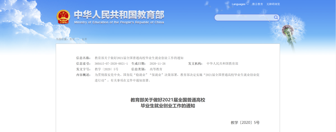 近日,教育部發布《關於做好2021屆全國普通高校畢業生就業創業工作的通知》。