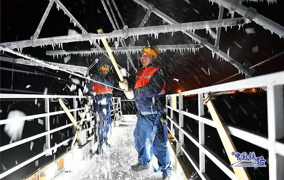 為儘快恢復列車運行,數百名“高鐵打冰人”冒着嚴寒開展除冰作業,連續奮戰幾個晝夜 。