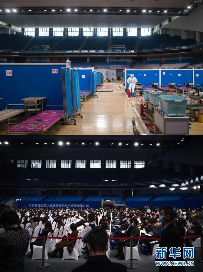 拼版照片:上圖為3月10日拍攝的武漢武昌方艙醫院。當日,武昌方艙醫院正式休艙。新華社記者 費茂華攝;下圖為12月2日,疫情期間作為武昌方艙醫院的武漢洪山體育館舉行2021屆全國普通高校畢業生就業招聘會等活動。新華社記者 肖藝九攝