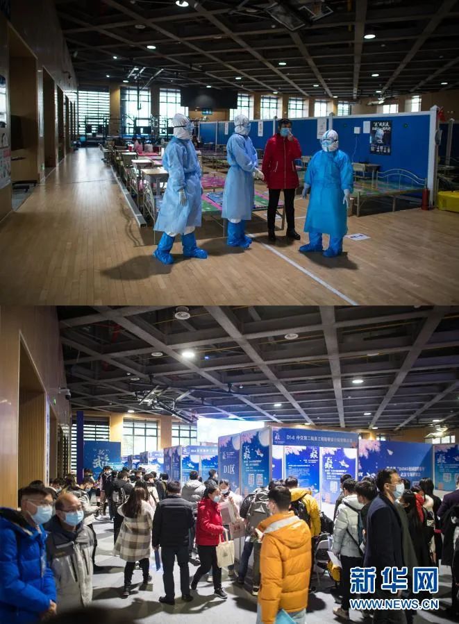 拼版照片:上圖為3月10日,醫護人員護送痊癒患者出艙。當日,武漢武昌方艙醫院正式休艙;下圖為12月2日,疫情期間作為武昌方艙醫院的武漢洪山體育館舉行2021屆全國普通高校畢業生就業招聘會等活動。新華社記者 肖藝九攝