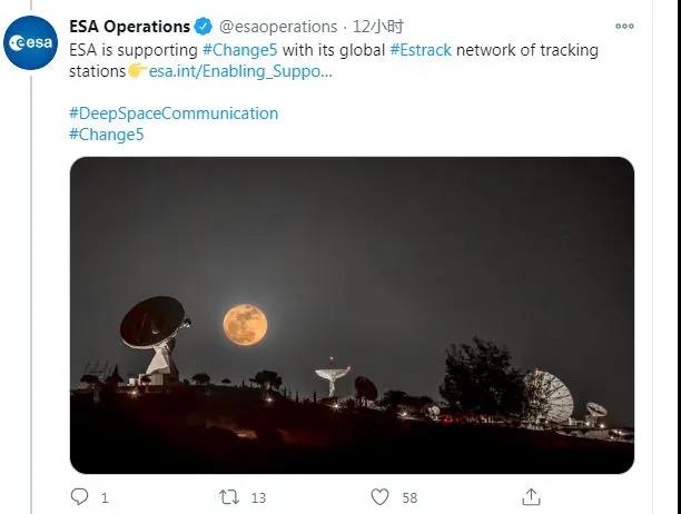 歐空局還表示,通過其全球跟蹤站網絡,歐空局為“嫦娥五號”探測器提供了技術支持。在“嫦娥五號”發射之後,歐空局位於法屬圭亞那的庫魯地面站曾對其進行數小時的追蹤。而在“嫦娥五號”返回地球的時候,歐空局將通過位於西班牙的馬斯帕洛馬斯地面站接收信號。