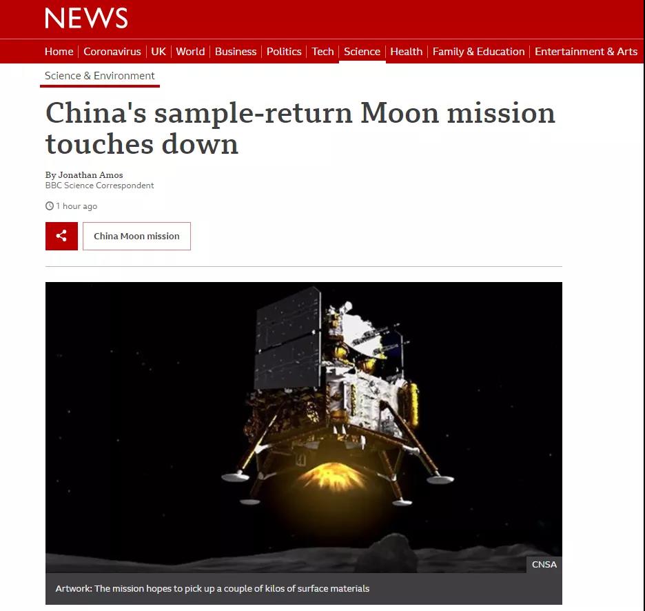 英國廣播公司(BBC)報道説,中國已經成功地對月球進行了另一次探測 。“嫦娥五號”探測器在月球着陸了!它的任務是收集約2公斤的月球“土壤”、“碎石”以帶回地球。距離人類上一次實現這一目標已有44年。