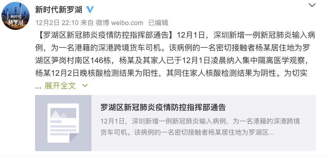 據深圳市羅湖區委宣傳部官方微信12月2日消息,羅湖區疫情防控指揮部通報,12月1日,深圳新增一例新冠肺炎輸入病例,為一名港籍的深港跨境貨車司機。