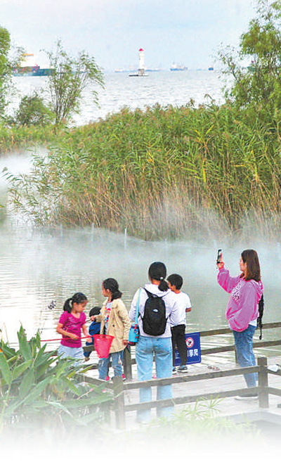 遊客在上海吳淞炮台灣國家濕地公園欣賞灘塗風光。楊建正攝(人民視覺)