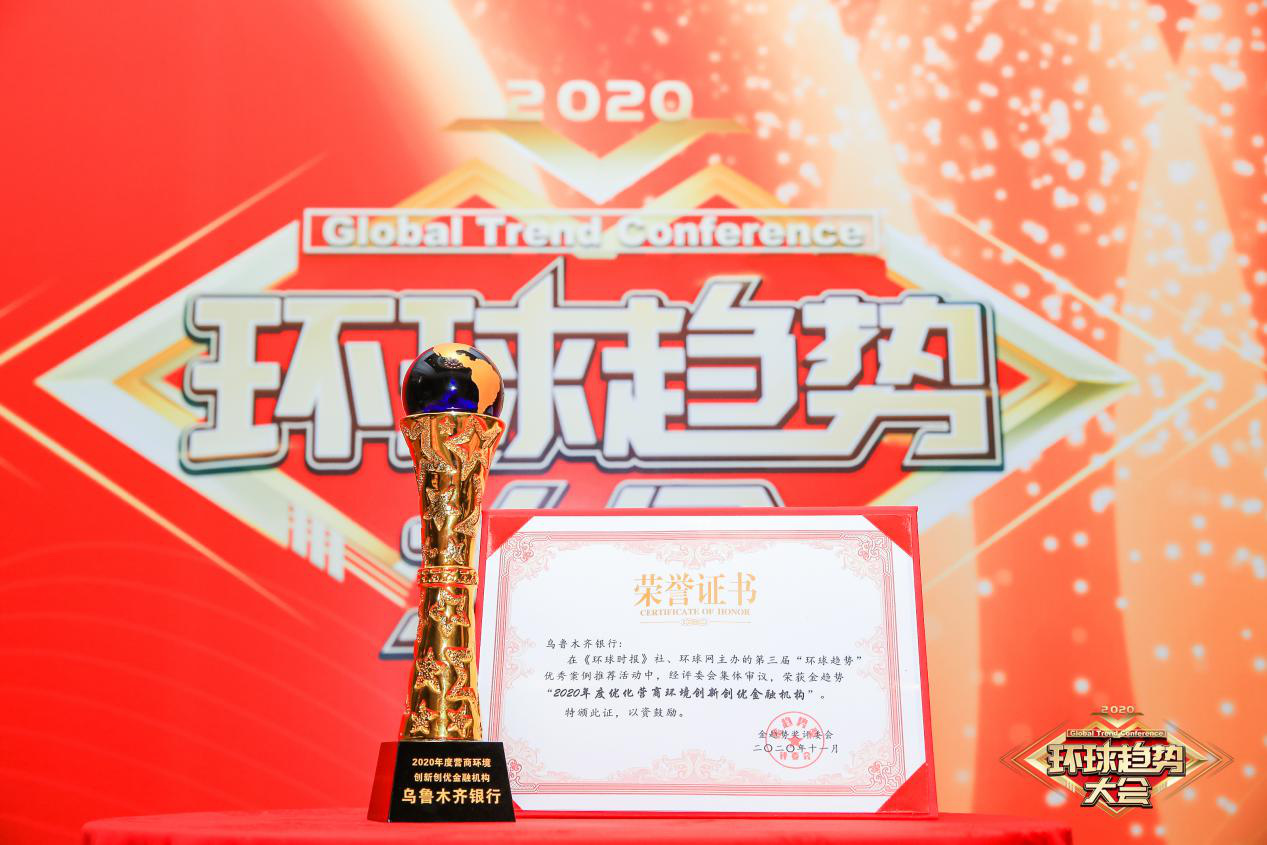 作為環球趨勢大會的重要活動,“環球趨勢優秀案例推薦”活動同步開展。其中,在營商環境優化方向,烏魯木齊銀行榮獲“2020年度優化營商環境創新創優金融機構”獎。