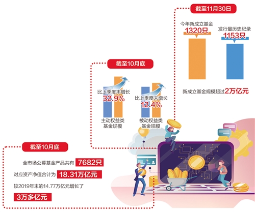 中國證券投資基金業協會最新數據顯示,截至2020年10月底,全市場公募基金產品共有7682只,對應資產淨值合計為18.31萬億元,較2019年末的14.77萬億元增長了3萬多億元,這是公募基金資管規模首次突破18萬億元,也是我國資本市場創立30年來公募基金數量首次突破7000只大關。