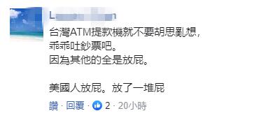 針對埃克斯的説法,有網民在該報道下跟帖稱“這是今年最好笑的笑話”,有島內網民稱,“以為中共艦隊是吃素的嗎?”“八隻小魚,最先被幹掉”。還有網民質疑《福布斯》,“Forbes什麼時候成了軍事雜誌?不懂的事情就別來插一腳笑掉大家大牙”。也有人批評民進黨當局,“乖乖吐鈔票吧,台灣ATM提款機就不要胡思亂想。”